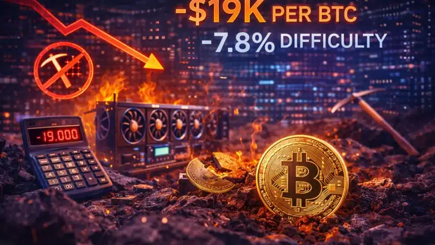 Bitcoin miners are producing BTC at an average cost of approximately $88,000 per coin while the market price has been trading near $71,000 to $77,000 through most of Q1 and early Q2 2026. The resulting loss of roughly $19,000 per BTC produced has triggered a wave of miner shutdowns, a 7.8% drop in mining difficulty, and a strategic pivot by major mining companies toward high-performance computing and AI data center hosting as alternative revenue streams. The difficulty adjustment on April 17 brought the network difficulty down from 138.97 T to 135.80 T.